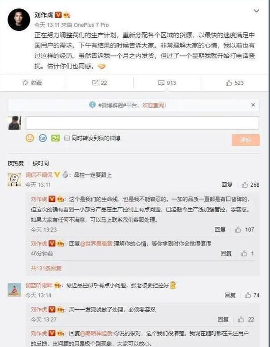 有网友拿到机器后表示一加7系列品控出现问题,并在微博上向刘作虎反馈。刘作虎回应称,这次的确有看到一小部分产品在生产控制上有点问题,已经勒令生产线加强管控,零容忍。