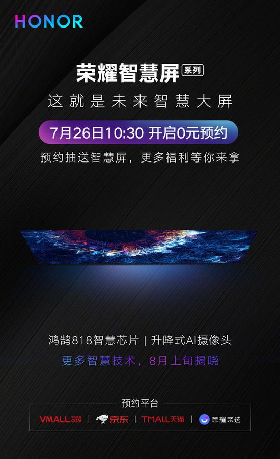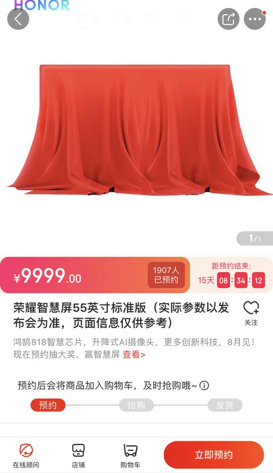 最后在大会上,赵明宣布荣耀智慧屏将会从即日起在Vmall、京东、天猫、荣耀亲选接受预约,目前已经可以打开京东页面进行预约这款名为荣耀智慧屏PRO 55英寸高配版的产品。目前预计这款产品会在8月10日在华为开发者大会HDC2019期间正式亮相。届时华为的自研鸿蒙系统将会首次在荣耀智慧屏上首发亮相,并成为鸿蒙系统全球首发的产品。而同样在今天曝光的华为系智慧屏新品类使用鸿蒙系统,预计华为智慧屏会在9月正式发布。