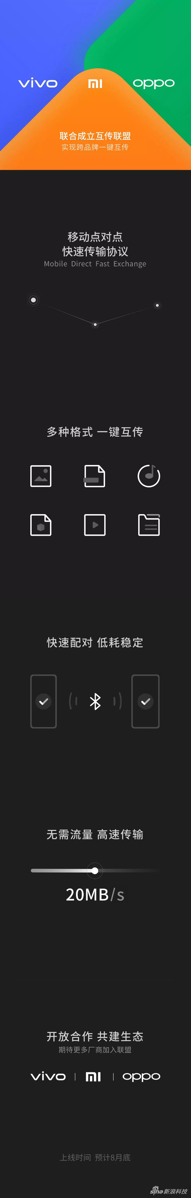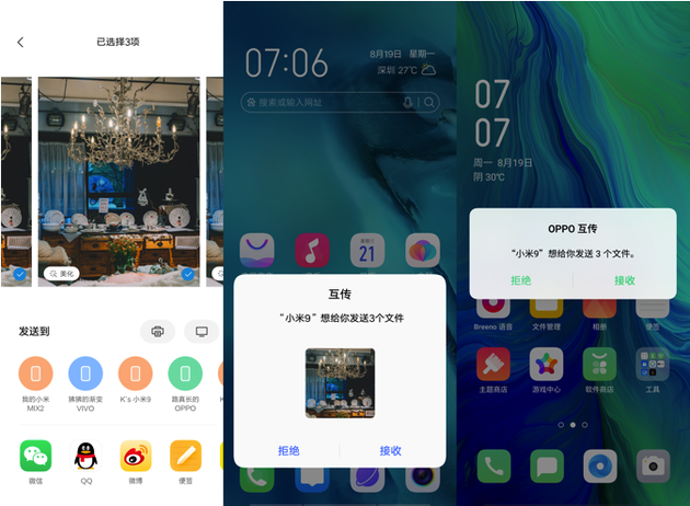 8月19日上午消息,今日小米MIUI发布公众号,宣布小米、OPPO、vivo三家成立互传联盟,将于近期开启公测,最终实现跨品牌一键互传。