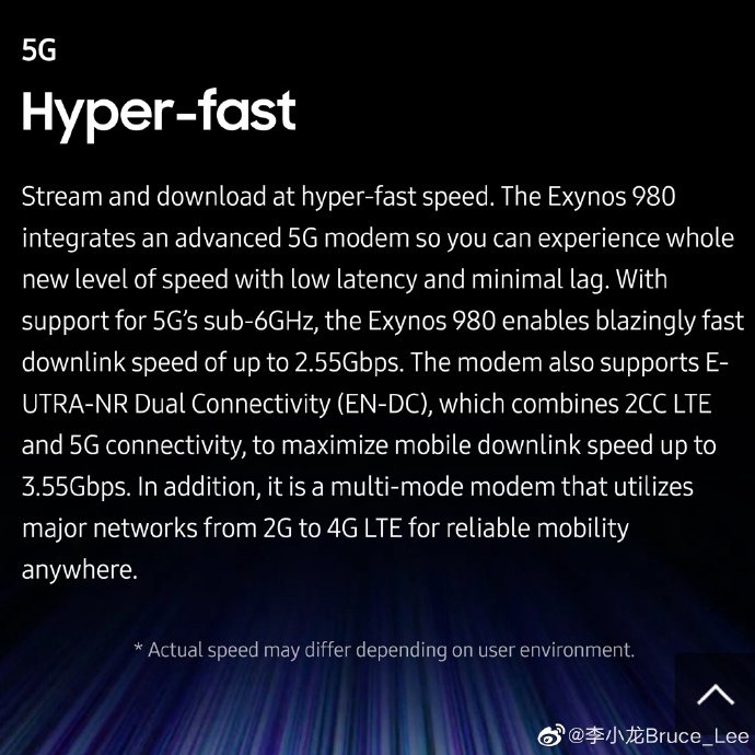 三星近日“官宣”了旗下首款集成5G基带的智能手机处理器Exynos 980,这款基于8nm FinFET工艺技术打造的芯片据称支持在5G网络Sub6GHz频段下实现最高2.55Gbps的下载速率。不过对于这一数据近日有华为高管对此提出质疑。