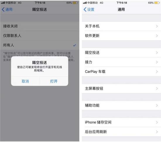 在苹果设备上面,点击[设置]进入里面,然后依次打开[通用]—[隔空投送]—选择[所有人],这里注意,定位服务功能要开启。隔空投送照片、打开相册、点击分享按钮,选择所连接到设备,点击隔开投送,之后从另一部设备上面点击接收按钮即可。