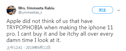 “在制造iPhone 11 Pro时,苹果并没有想到我们这些密集恐惧症患者。我无法购买这部设备,每次看到时我都会浑身发痒,”一位Twitter用户本周早些时候发推文称。