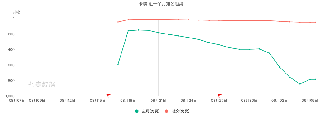 从8月16日正式上线的两周时间里,卡噗在App Store 社交(免费)下载榜的排名一直在50名以内,最靠前的是11名。
