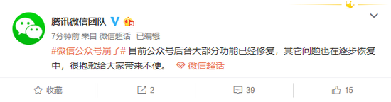 微信发文宣布:目前公众号后台大部分功能已经修复