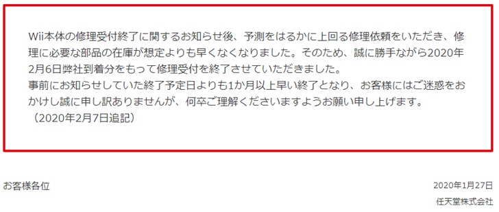 1月27日任天堂发布声明,称从2020年3月31日开始将不再接受Wii主机的修理请求(型号RVL-001)。理由是需要购买所需的零件。库存用完后,Wii外设的维修也将关闭。