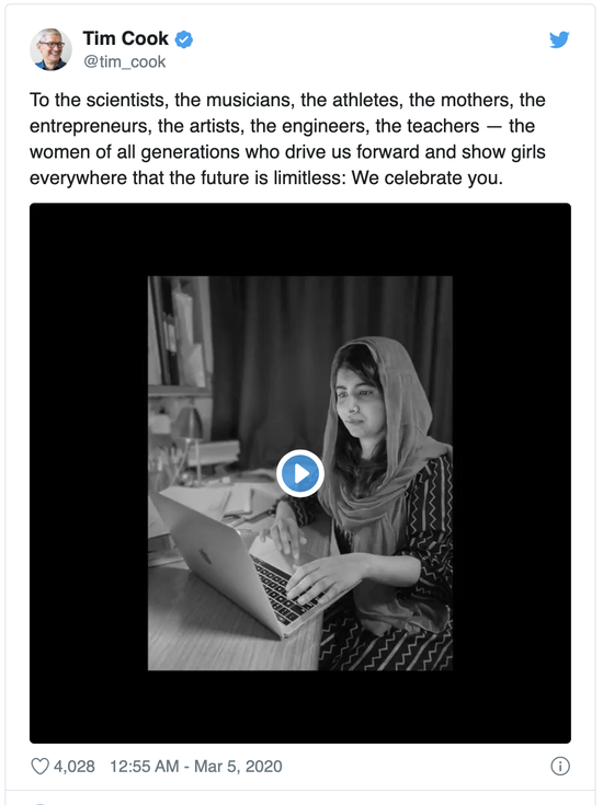 苹果CEO蒂姆·库克发Twitter庆祝国际妇女节