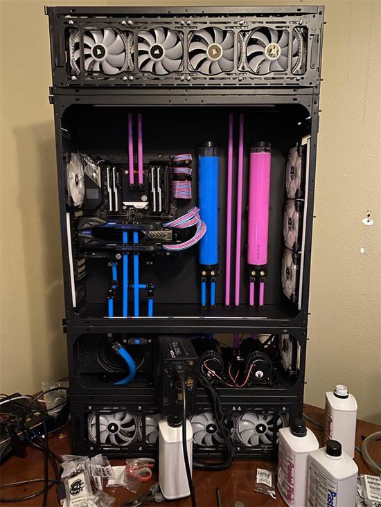 这款机箱内搭载了两块EVGA GeForce RTX 2080 Ti显卡,SSD为Intel Optane 900,容量为480 GB,内存为芝奇的Trident Z Neo DDR4 3200,容量为128GB,主板为华硕ROG Zenith II Extreme Alpha主板。为了给这套装备提供优良的散热,该用户用上了47块机箱风扇,其中包括19个海盗船 HD140风扇和28个ML140 Pro风扇。