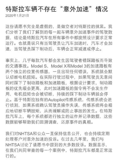 针对此事,1月21日下午,特斯拉官方微博发布回应称,”特斯拉车辆不存在“意外加速”情况“。