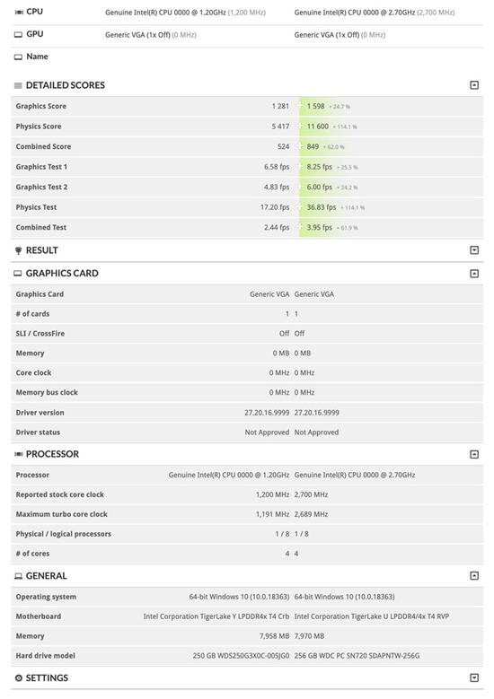 上图中的数据为Tiger Lake-Y与Tiger Lake-U的对比,两款处理器都是4核8线程,英特尔并不想加入AMD的“核战”。就CPU的游戏性能而言,这款U系列(可能是28W版)比Y系列处理器高了一倍,GPU性能高24%。