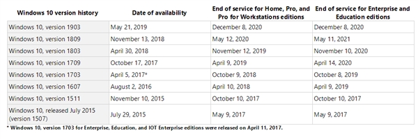 Windows 10 2015年正式发布以来,已经先后进行了其次重大更新,未来仍会坚持每年两次的节奏。按照微软政策,每个版本的寿命一般为18个月,教育版和企业版最长30个月,过期后将失去修复补丁、安全补丁等技术支持,但用户仍可继续使用并承担风险,此前微软也不会干预。