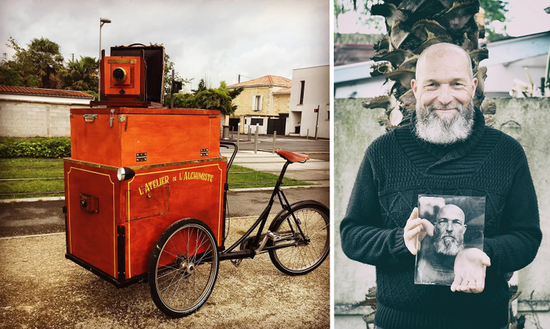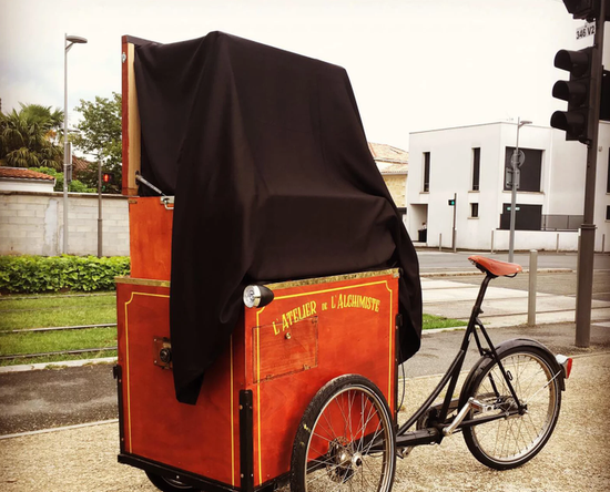 据悉,整个移动暗室装置重达250千克,但是相对于房车暗室来说已经算是便携了,三轮车很容易四处移动,可以进入行人区域。Tirat已经带着它的移动暗室走遍了法国波尔多,拍摄出了很多极具艺术感的照片。另外,Michaël Tirat的摄影暗室由上下两部分组成,上面是暗室,下面是储存材料的地方。它能够拍摄10x12cm到18x24cm尺寸之间的照片。
