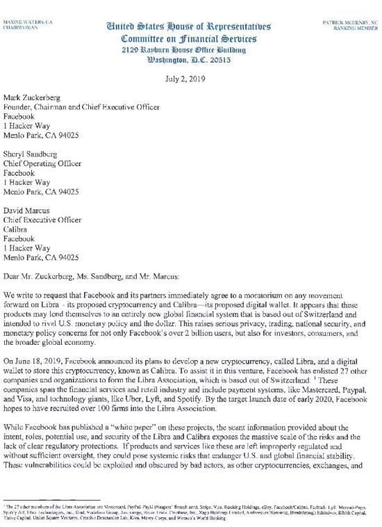 沃特斯今天致信Facebook CEO马克·扎克伯格(Mark Zuckerberg)、COO雪莉·桑德伯格(Sheryl Sandberg)和Calibra CEO大卫·马库斯(David Marcus)正式提出了几周前的这一要求。除了沃特斯之外,众议院金融服务小组委员会的其他领导人也签署了这封邮件。