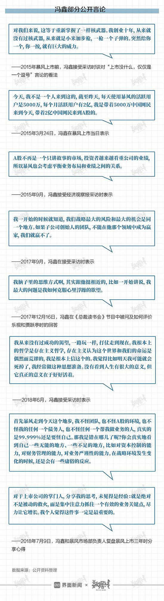 作为一名知名创业人,冯鑫经常在个人微博上发声,也曾多次接受媒体采访。在暴风上市前,冯鑫曾表示上市“等于重新掌握了一样核武器”;在2018年暴风上市三年、业务陷入困局时,冯鑫也曾作个人检讨:“真实的是99.999%还是要怪自己”。