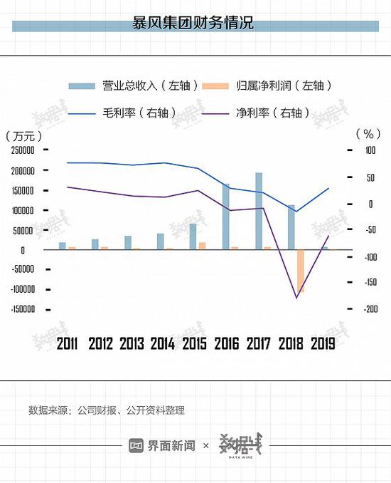 财务数据方面,暴风集团在2015年上市之后,除营业收入在2016年和2017年有所攀升外,其他盈利关键指标均呈下滑趋势。2018年,暴风集团的净利润亏损高达10.9亿元。2019年一季度,暴风集团净利率为-61.82%,亏损1749万元。