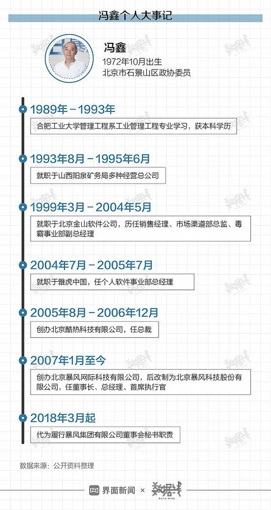 公开资料显示,冯鑫1993年大学毕业,1999年进入金山软件公司,历任销售经理、市场渠道部总监和毒霸事业部副总经理。2004年至2005年,冯鑫曾短暂入职雅虎中国,任个人软件事业部总经理。