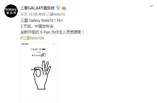 近日三星GALAXY盖乐世官方通过微博为即将到来的三星Galaxy Note 10系列新品发布会预热并配文:“三星Galaxy Note10 | 10+,3天后,中国发布会,全新升级的S Pen为你注入灵感源泉!”,同时文字下方还有一个主打S Pen的动图。
