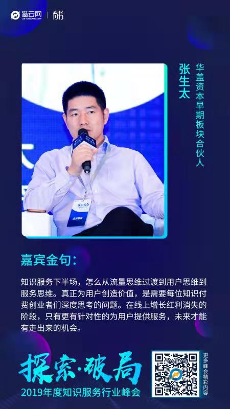 张生太:知识付费这一块确实从2018、2019年比较难投,我们越来越谨慎。一般投早期项目的话,还是看人,以及做事情的初心。现在即使有好的内容,在流量增长结束的阶段,要再跑出来的难度非常大。所以早期投资在知识付费领域,非常有难度。
