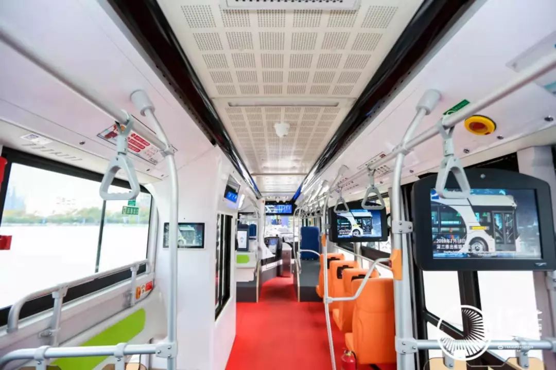 公交车身宽敞,车内很多摄像头和大大小小的屏幕。有语音交互屏——出行助手“兰博”,通过语音对话,说出想去的地点,显示屏很快就将具体路线显示出来,非常方便;座椅背后的屏幕可以放电影,也可提供生活、路线、娱乐等各种资讯。车内还有AI自助贩卖机,通过刷手就可进行支付和购物。