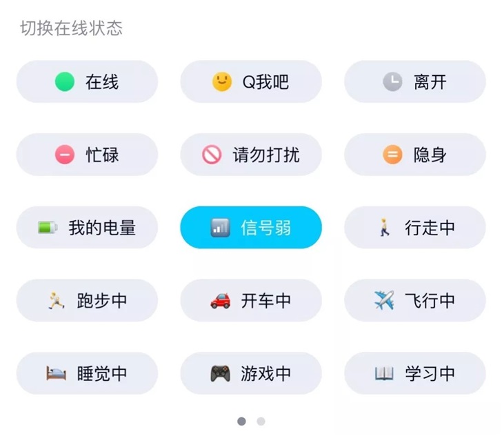 小姐姐:在线状态全新改版,新增“我的电量”、“信号弱”、“行走中”等更结合用户真实生活场景的在线状态,让用户线下状态更准确、生动地同步给好友,让线上沟通更亲密顺畅。
