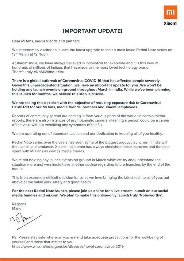 小米全球副总裁、小米印度业务总负责人Manu Kumar Jain表示,为了保证大家的安全健康,我们做出了上述决定,大家可在小米官网观看Redmi Note 9发布会直播。