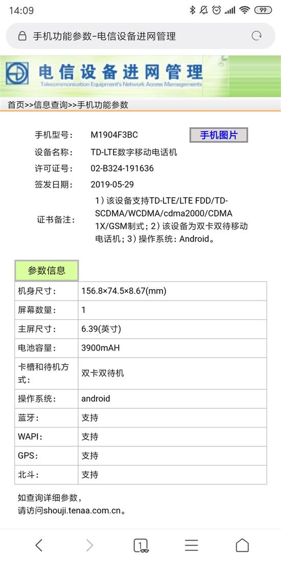 6月19日消息,型号为M1904F3BC的小米新机通过工信部入网许可。