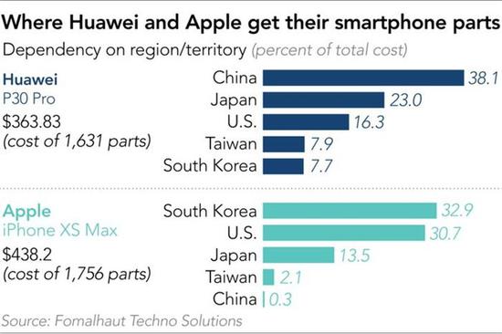 东京研究机构Fomalhaut Techno Solutions的数据显示,按成本来算的话,华为P30 Pro中62%的零部件是由中国以外的公司生产的;其中有38.1%来自中国,23%来自日本,16.3%来自美国,7.9%来自中国台湾,7.7%来自韩国。