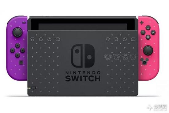 新限定版主机的Joy-Con选择了紫色和暗粉色的搭配,和底座一块打满了规则的圆点和红心方块黑桃梅花图案,主机的底座以及背面还额外印着米奇米妮斯蒂奇等经典迪士尼角色的头像,右手Joy-Con的Home键也加上了迪士尼的标志性米老鼠耳朵图案装饰,整一个可爱的风格,外观更适合喜欢迪士尼人物的妹子。