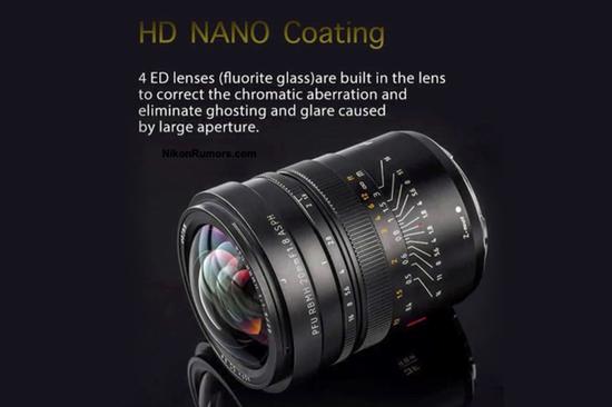 镜头内置4个ED镜片(萤石玻璃),有效减小色差,消除大光圈产生的重影和眩光。镜头重量为782g,无镜头盖的整体长度为104mm。