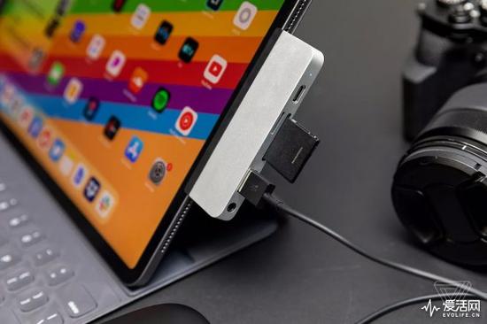 与MacBook Pro的USB Type-C扩展一样,在iPad Pro上有一种能够与平板合体的扩展接口设计。例如下图的HyperDrive 6in1,通过USB Type-C可以将接口扩展出USB Type-A、USB Type-C充电、读卡器和3.5毫米音频口。但这样的设计往往会增加接口的连接负担,并增加iPad Pro的机身重量。