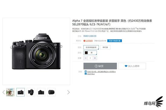 索尼中国官方商城提示α7套机为缺货状态,单机身为售罄