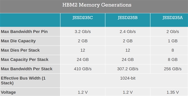 本周,固态存储协会(JEDEC)发布第三版HBM2存储标准JESD235C,将针脚带宽提高到3.2Gbps,前两版中依次是2Gbps、2.4Gbps,环比提升33%。