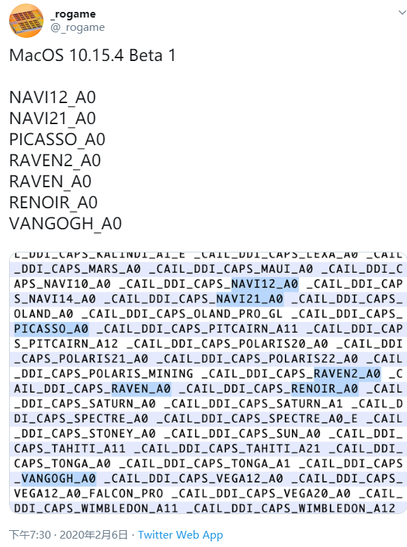 从 _rogame 的博文看,他在测试版系统中找到了‘Renoir、Raven、Vangogh、Picasso、Navi’几个产品代号,其中‘Vangogh’和‘Navi’是之前在 macOS Catalina 15.2 beta 版本都出现过的疑似 AMD 产品代号,而这次出现的‘Renoir’,则是把答案指向了 AMD 在今年年初在 CES 上发布的 Ryzen 4000 APU,它基于 AMD 最新的 Zen 2(7nm) 架构打造。