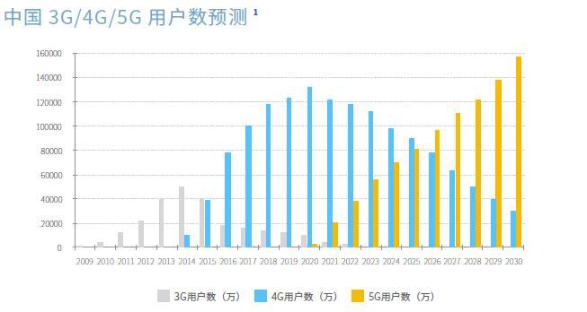 上述报告认为,中国5G网络建设是个循序渐进过程,未来十年4G和5G将共存。未来5G用户的渗透速度要稍慢于4G用户。根据中国信息通信研究院的预测数据,2025年5G用户将达到8.16亿户,移动用户渗透率将达到48%左右,2025年后,5G用户渗透率加快增长,相比于商用前5年渗透率每年平均增加7.4%,预计2030年5G用户规模将达到15亿户,渗透率在85%左右。