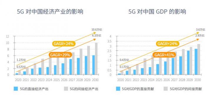 报告认为,到2030年,在直接贡献方面,5G将带动的总产出、经济增加值分别为6.3万亿元、2.9万亿元;在间接贡献方面,5G将带动的总产出、经济增加值分别为10.6万亿元、3.6万亿元。