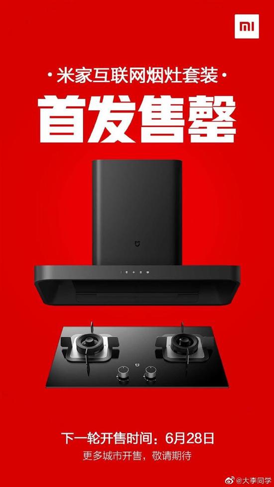 6月16日深夜,小米公司生态链产品总监大李同学发布米家互联网烟灶套装战报,宣布米家互联网烟灶套装首发售罄,6月28日开启下一轮销售。