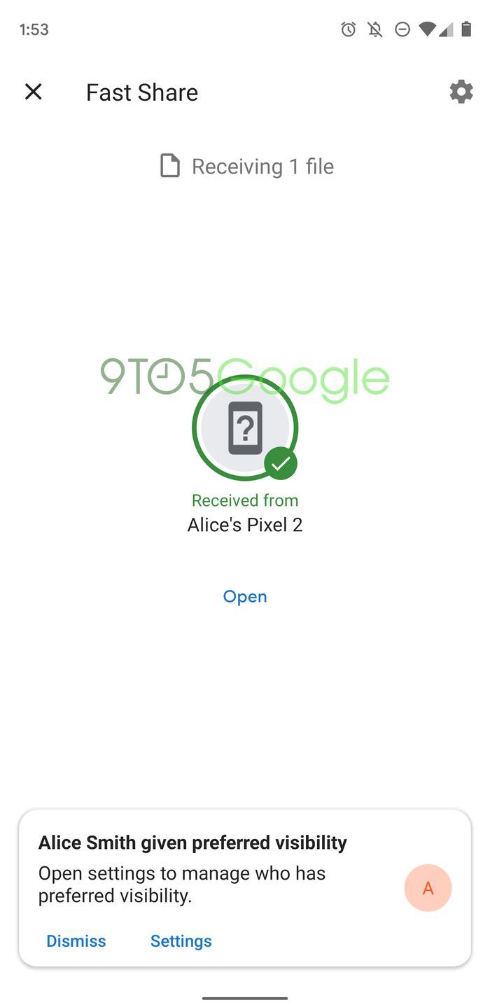 当Android设备通过Fast Share接收文件的时候,你会获得包括“设备名称”和“连接ID”的提醒通知,通知上可以选择“接受”或者“拒绝。”此外还有一个具备相同控件的全屏页面。在完成文件传输之后用户能够直接打开文件。