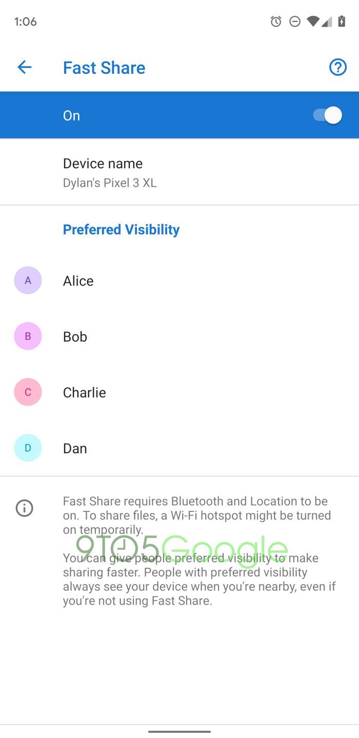在安全和保障方面,Fast Share可让您为频繁发送者提供“首选可见性”。主要共享界面的右上角提供了该功能的设置。您可以为人们提供首选的可见性,以便更快地进即使您没有使用快速分享,具有首选可见度的人也会在您附近时看到您的设备。