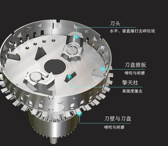 厨房垃圾处理器没有锋利的刀片,主要利用研磨锤把食材打碎,因为是研磨而不是切割所以肯定不够精细,不过现在有些旗舰机型在原来常规的研磨结构之外,底部又增加了一个旋转刀片,食材经过多级研磨变得更为细腻,这样就能非常轻松的随水流进入下水道。