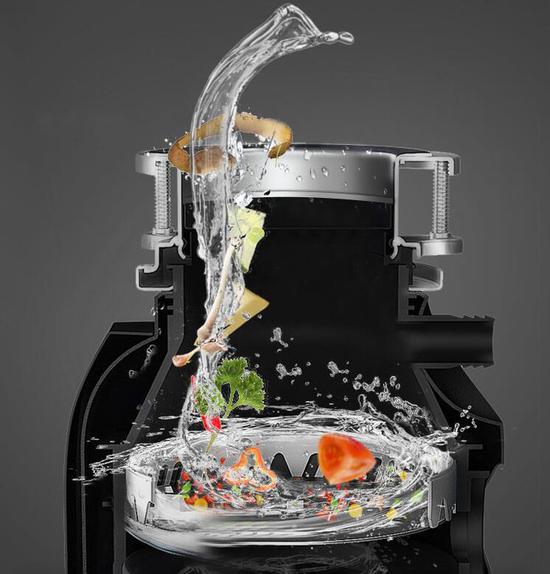 厨房垃圾处理器的工作原理和榨汁机或破壁机比较相似,它们的目的都是把食物打碎,不同的是,厨房垃圾处理器采用的是无刀片设计,通过电机的高速运转带动研磨盘,使用研磨锤把食物垃圾打碎,然后处理成小块垃圾随水冲走,所以并不像破壁机那样会把食材打得非常细腻。