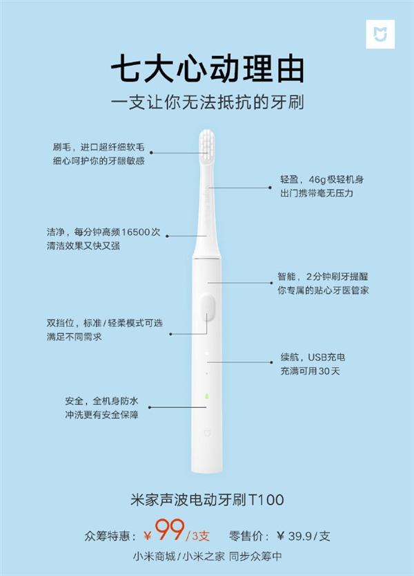 9月18日消息,今天上午10点,全新的米家声波电动牙刷T100在小米商城、小米之家同步开启众筹。众筹定价99元/3支,未来的零售价为39元一支。