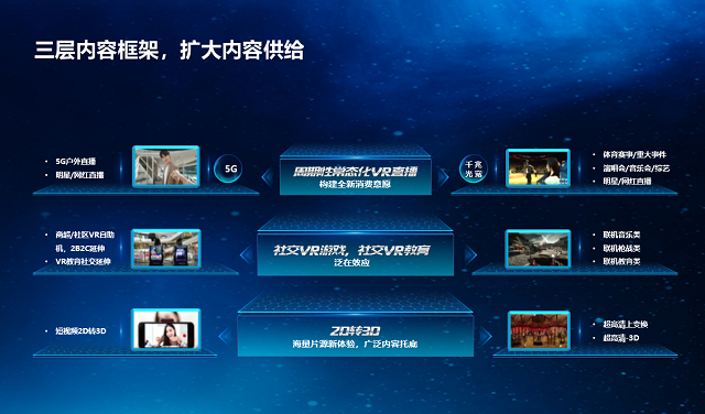 手机应用以百万计,而全球优质VR内容只有几千部。针对目前困扰产业的VR内容匮乏问题,华为结合对VR用户的理解和实际部署经验,提出VR “三层框架”以扩大内容供给。首先2D转3D,为VR产品做海量内容托底;其次增加社交属性,让VR游戏、VR教育等应用联机变现;最后开展常态化VR直播,吸引新用户、促进活跃度。