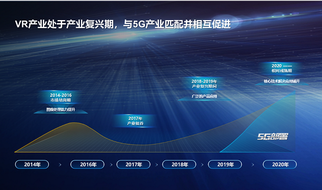VR产业经历了产业炒作高峰后,在2017年跌入低谷。他认为,VR终端产品的推陈出新以及5G的商业部署正在促使其走出产业低谷,2019是产业的复兴期:“韩国某运营商的实践显示,5G和VR的重合度达到45%。VR对移动网络提出更高的需求,而大带宽、低时延的5G使得VR在移动场景下的应用成为可能。电信运营商即将启动5G规模化建设,两者将相互促进。”