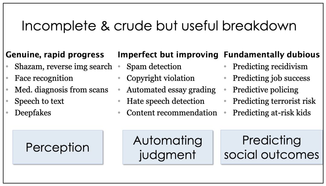 首先,阿文德认为,现在的AI应用可以分成三类: