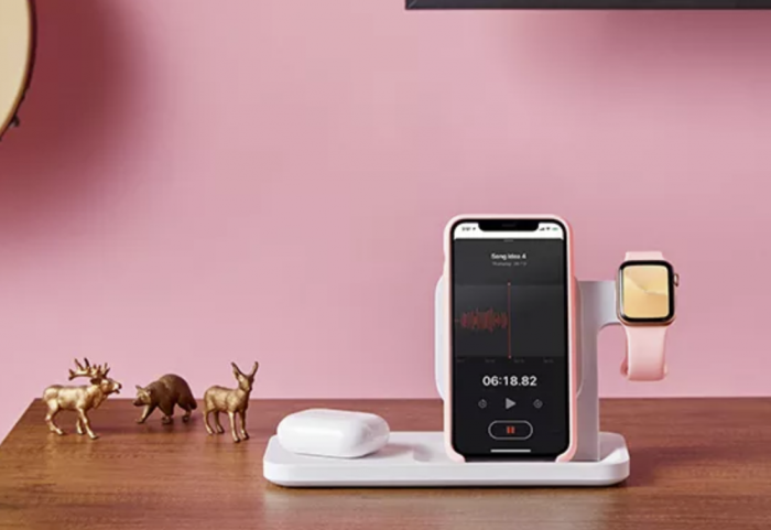 与其他AirPower替代产品一样,三合一充电座有两个无线充电区,一个用于电话的站立式充电垫和一个用于耳机的平板充电垫。此外,这款设备还配备了一个集成的苹果手表充电器,允许用户同时为所有三台苹果日常设备充电。